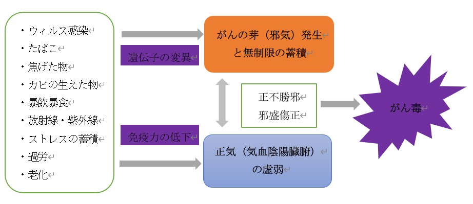 様々な原因により邪熱火毒・肝気鬱結・気滞血瘀・痰湿 積聚・経絡瘀阻・気血虚損および臓腑の働きのバランスが崩れるなどの原因が長引くと、がんが発生やすくなる。