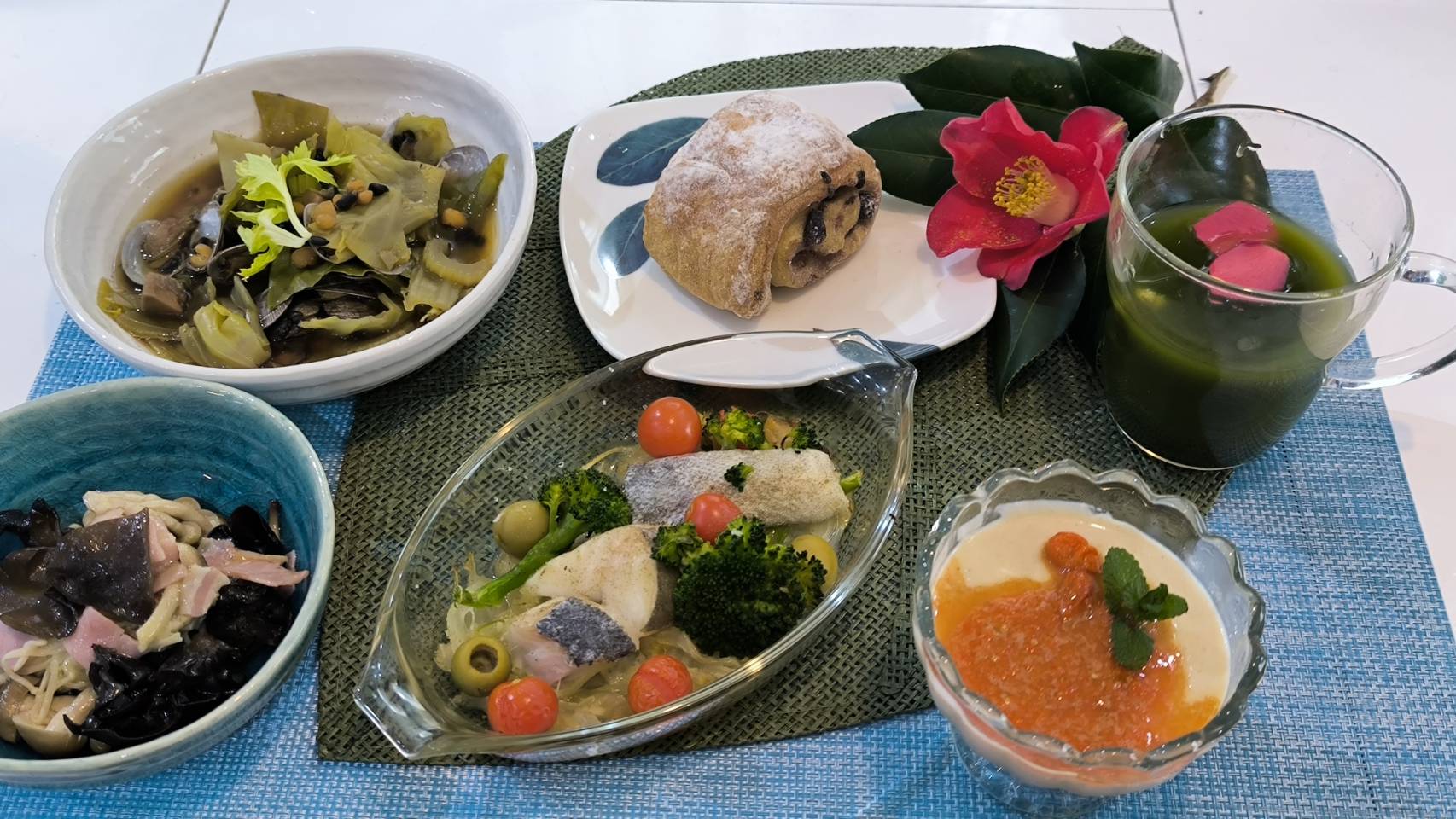 ・たらのアクアパッツァ ・黒豆パン ・あさりと春キャベツの決明子スープ